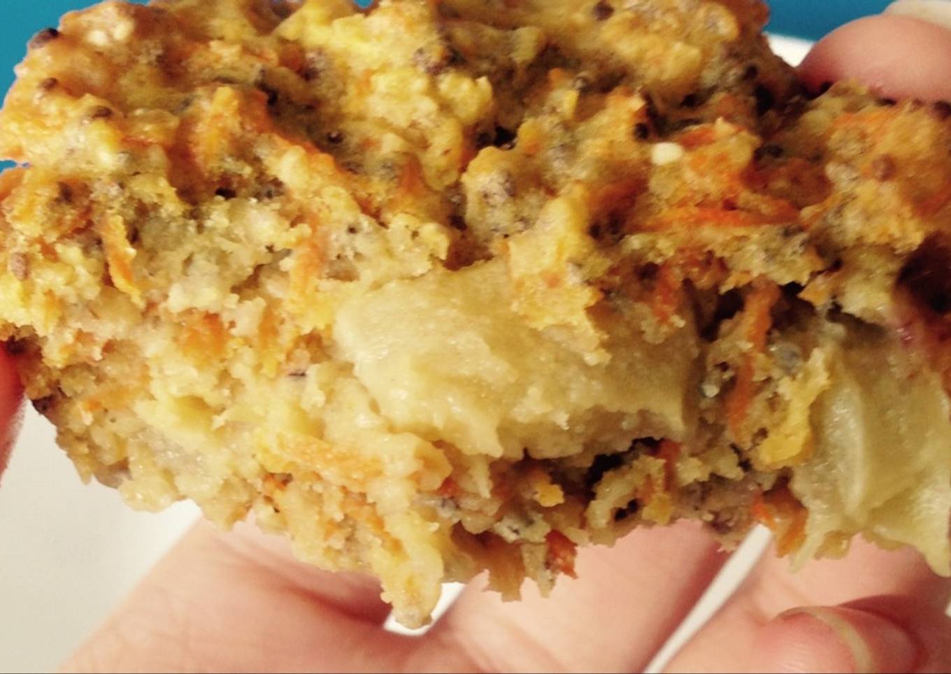 - In a small bowl, mix together green yogurt, egg, honey, vanilla, grated carrots, grated apple, and chopped apples