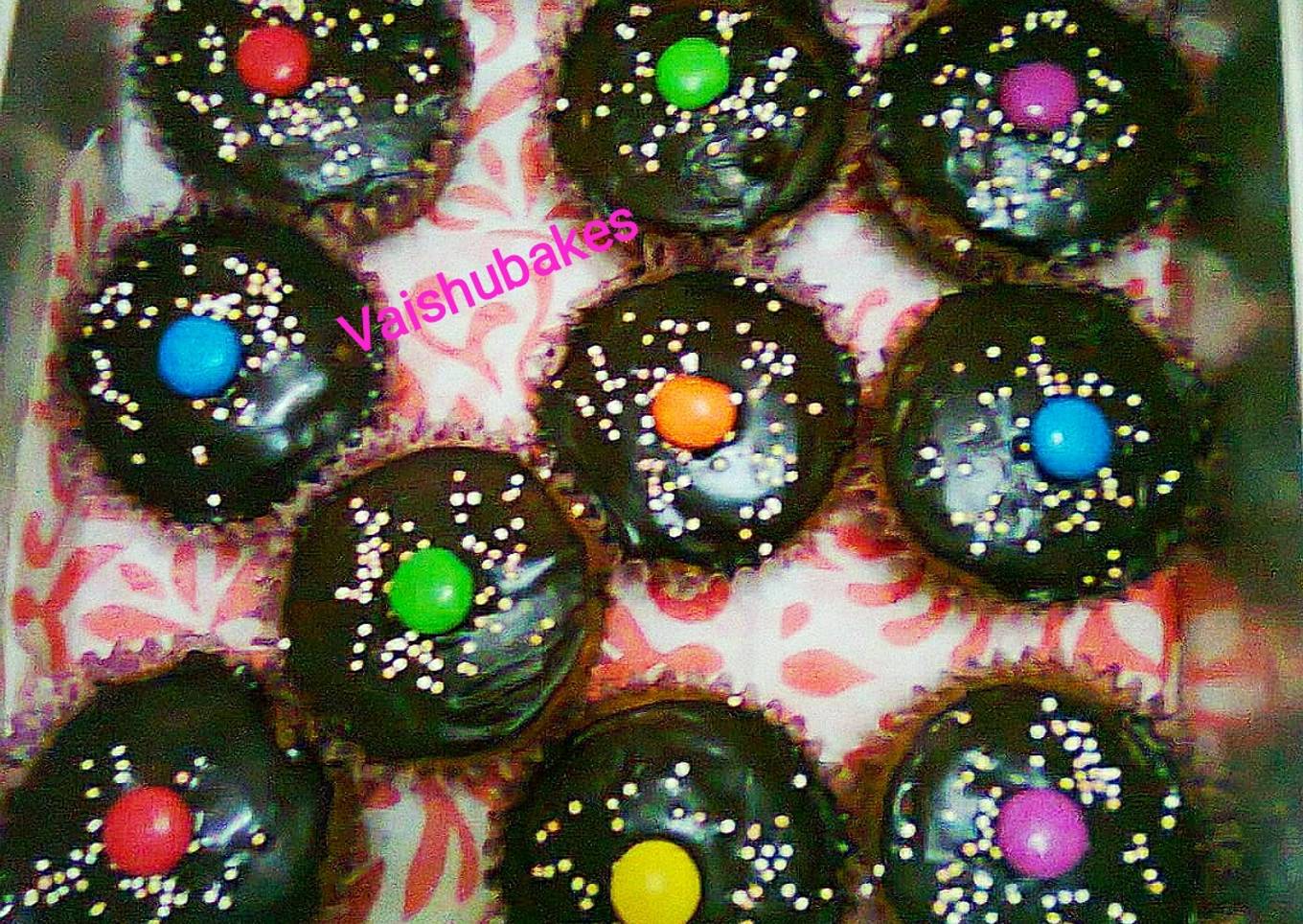 - Place a damp kitchen towel over the muffins for 10 minutes to make them soft. When they are cooled completely, spread melted dark chocolate on each muffin top and garnish with colourful gems. Enjoy.