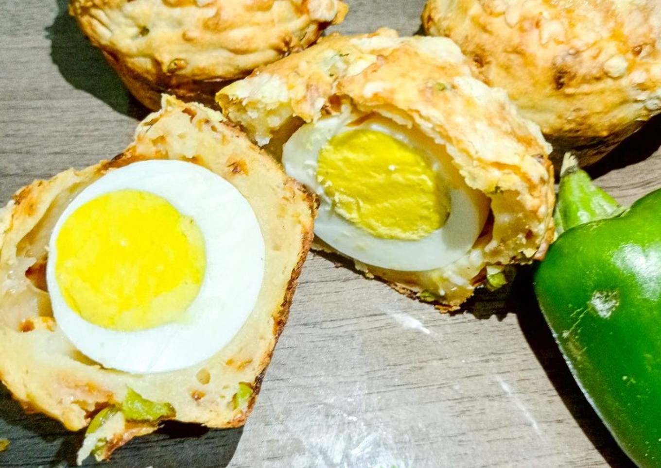 - Now grease well the muffin tray and add 1 heaped spoon of mixture.Put a hard boiled egg on to it. Now again put mixture onto egg and cover well.Add some extra cheese on top.