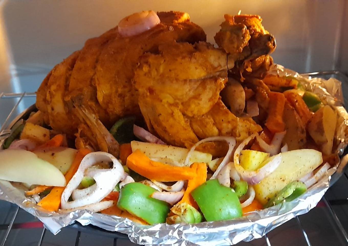 - 1 baking tray me Aluminium paper lagaye sari kuti huwi vegetables lagaye black pepper salt lemon juice dale aur center me chargha rakh k charge ko 30 mints upar wale rode pe bake karein jab cloure ajaye to nikal lein